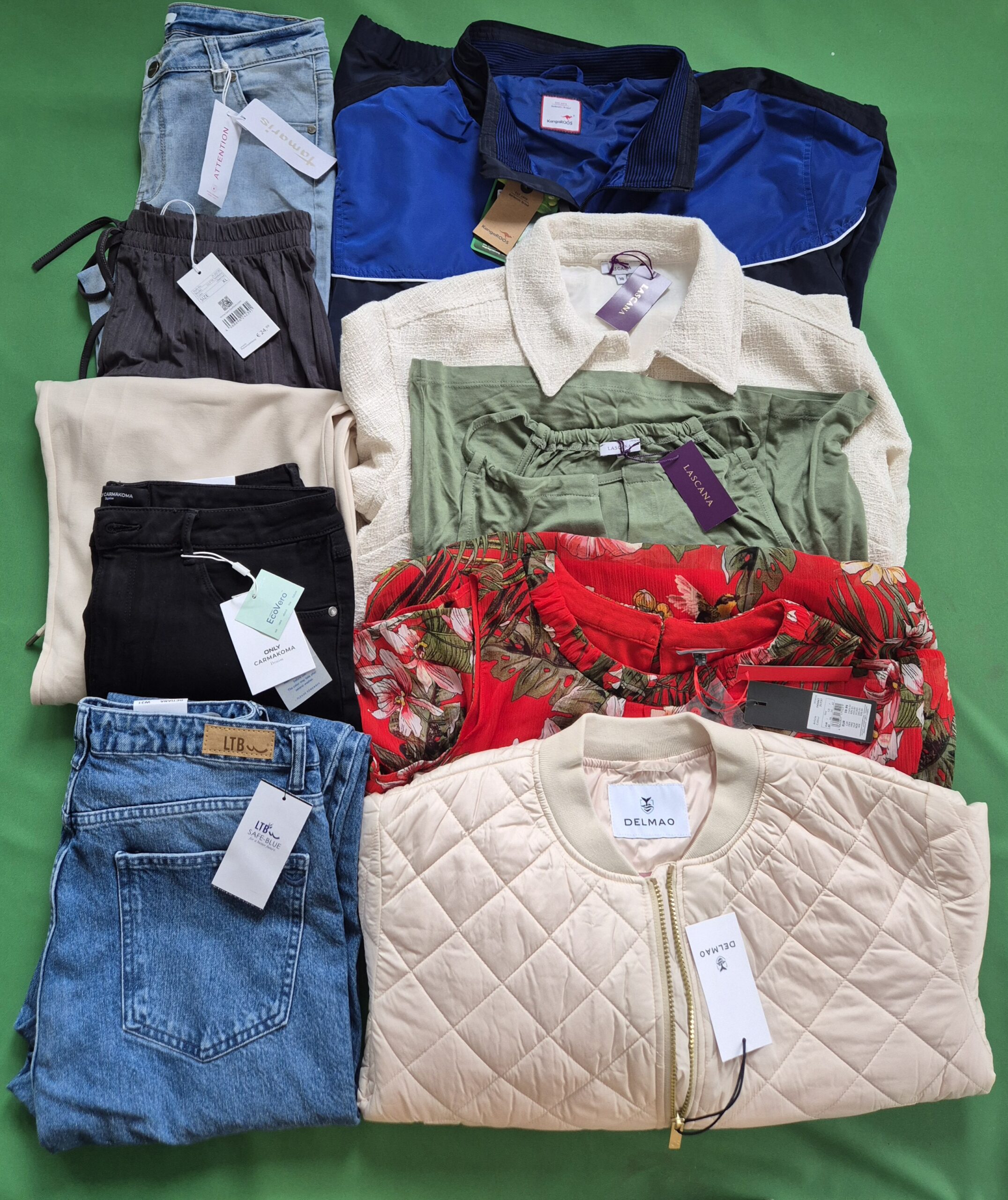 Pakiet 10 sztuk nowej odzieży damskiej to wszechstronny zestaw obejmujący cztery kategorie produktowe: kurtki, spodnie, bluzkę i sukienkę. Taki mix daje szerokie pole do kompletowania stylizacji i pozwala obsłużyć klientki szukające zarówno odzieży wierzchniej, jak i codziennych podstaw garderoby. Mocną stroną pakietu jest część kurtkowa - pikowana bomberka Delmao w eleganckim beżowym odcieniu, sportowa kurtka KangaROOS w rozmiarze 3XL (poszukiwany segment plus size) oraz lekka narzutka Lascana o tweedowej fakturze. Spodnie reprezentują pięć różnych fasonów i marek: jeansy LTB, dresowe SuperSoft, casualowe Hailys i Tamaris oraz Only w rozmiarze 46. Zestaw dopełnia kwiecista sukienka Only i bluzka Lascana. Wszystkie produkty są fabrycznie nowe z oryginalnymi metkami producenta. Materiały to przede wszystkim wiskoza, bawełna, elastan i poliester - tkaniny wygodne, łatwe w pielęgnacji i dobrze się noszące. Zakres rozmiarów od M do 3XL obejmuje również segment plus size, co zwiększa potencjał sprzedażowy pakietu.